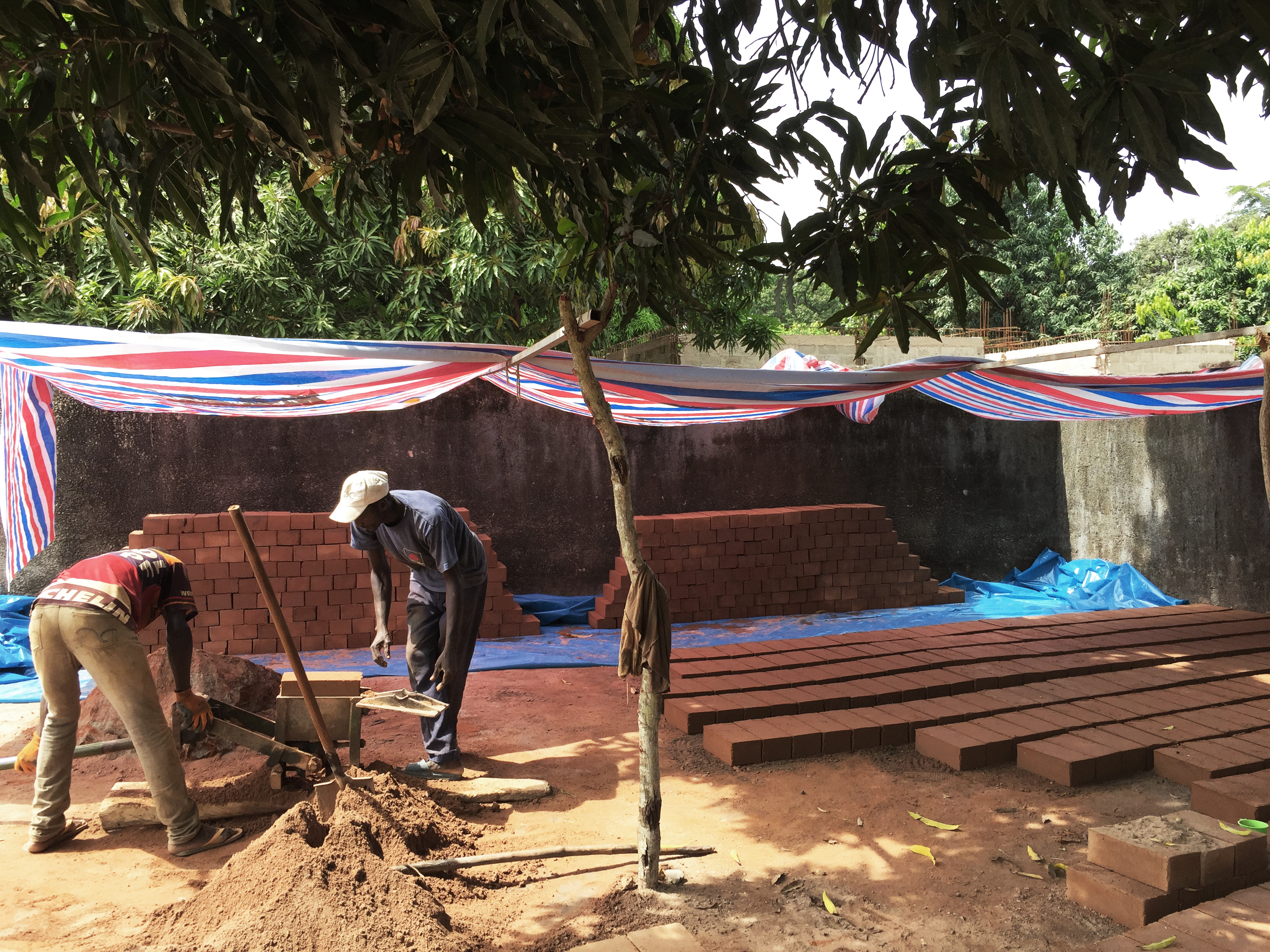 Senegal. Dos especialistes de BTC que venen d’Abené treballant en la fabricació de BTC, per la construcció dels murs de la que será la nova maternitat de Thiobon.