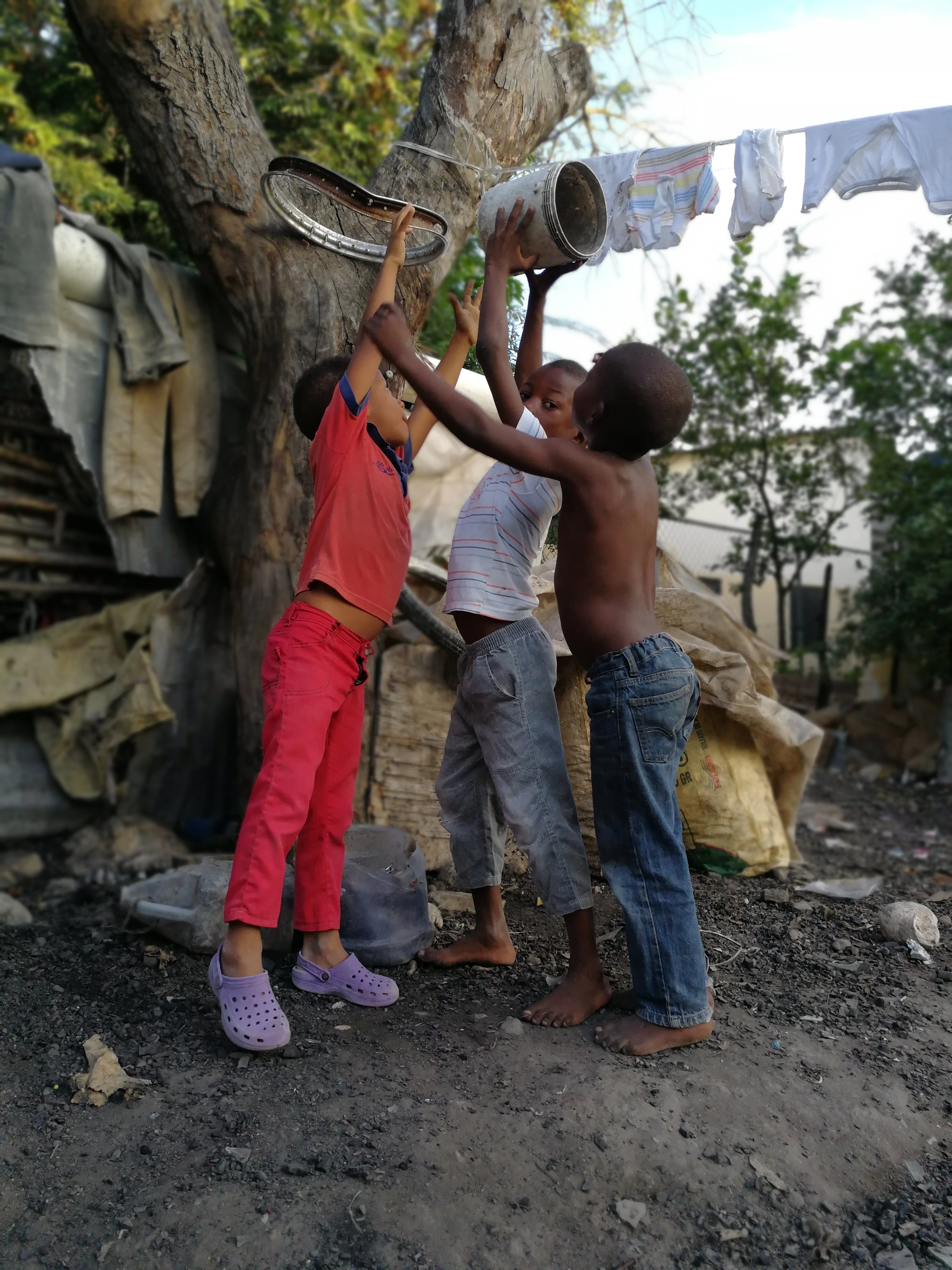 República Dominicana. Més enllà del fet de que els nens juguen a Basket amb el que poden, el que cal destacar és el fet de que un nen dominicà (pell clara) estigui jugant amb dos haitians al pati de la casa dels últims. La societat dominicana es caracteritza, entre altres fets, per un racisme molt arrelat contra els haitians. Els nens de la fotografia han participat des de molt petits en els programes de Sonríe y Crece, el que ens porta a afirmar amb orgull que els nostres esforços per lluitar contra el racisme funcionen.