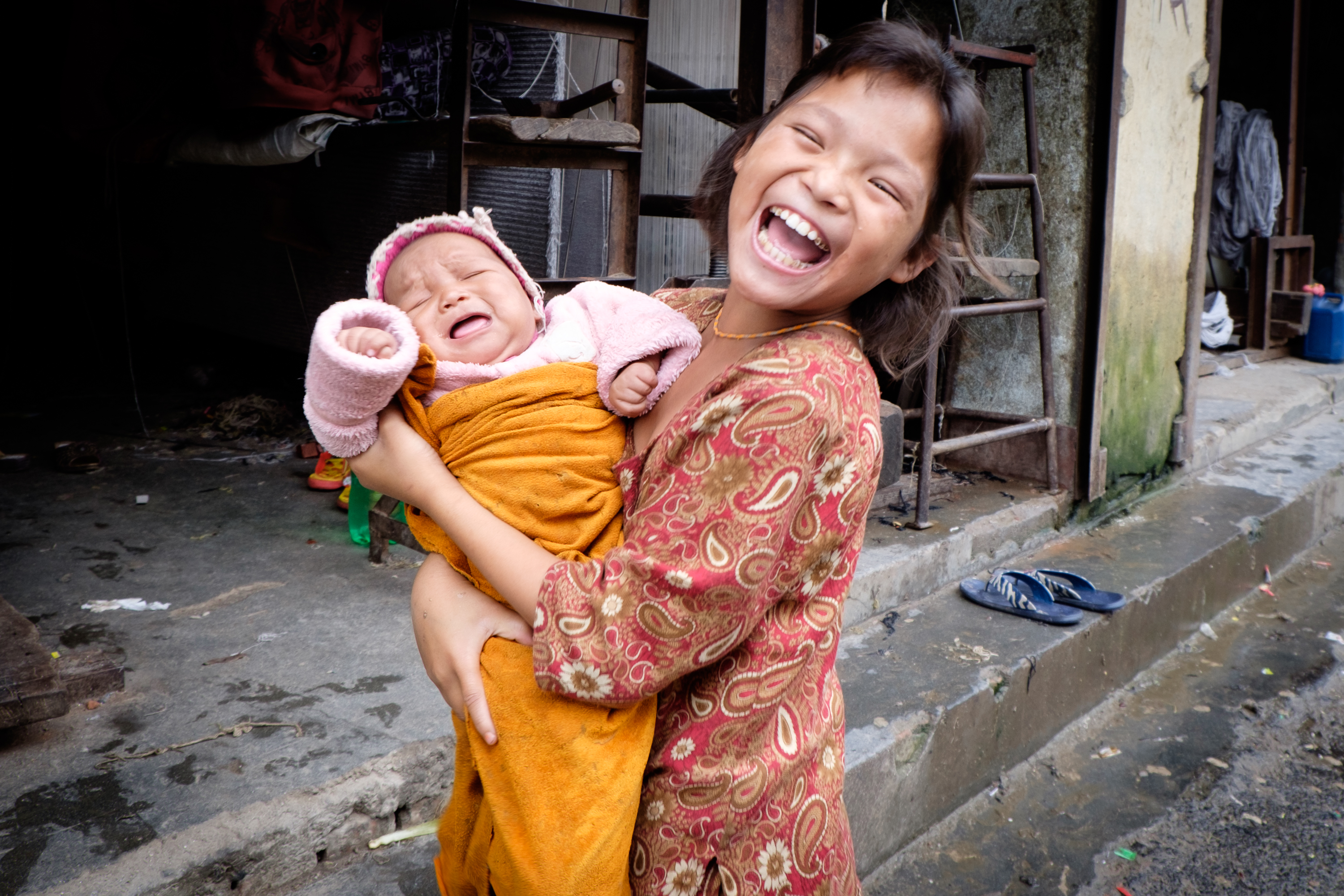 Nepal. En este barrio de Katmandú llamado Nayabasti, la mayoría de las mujeres trabajan durante jornadas extenuantes en oscuros telares. Por eso es muy habitual que las hermanas mayores, aún en la infancia, tengan que encargarse durante todo el día del cuidado de sus hermanos y hermanas bebés. En esta foto, las dos hermanas están en la puerta del telar donde trabaja su madre.