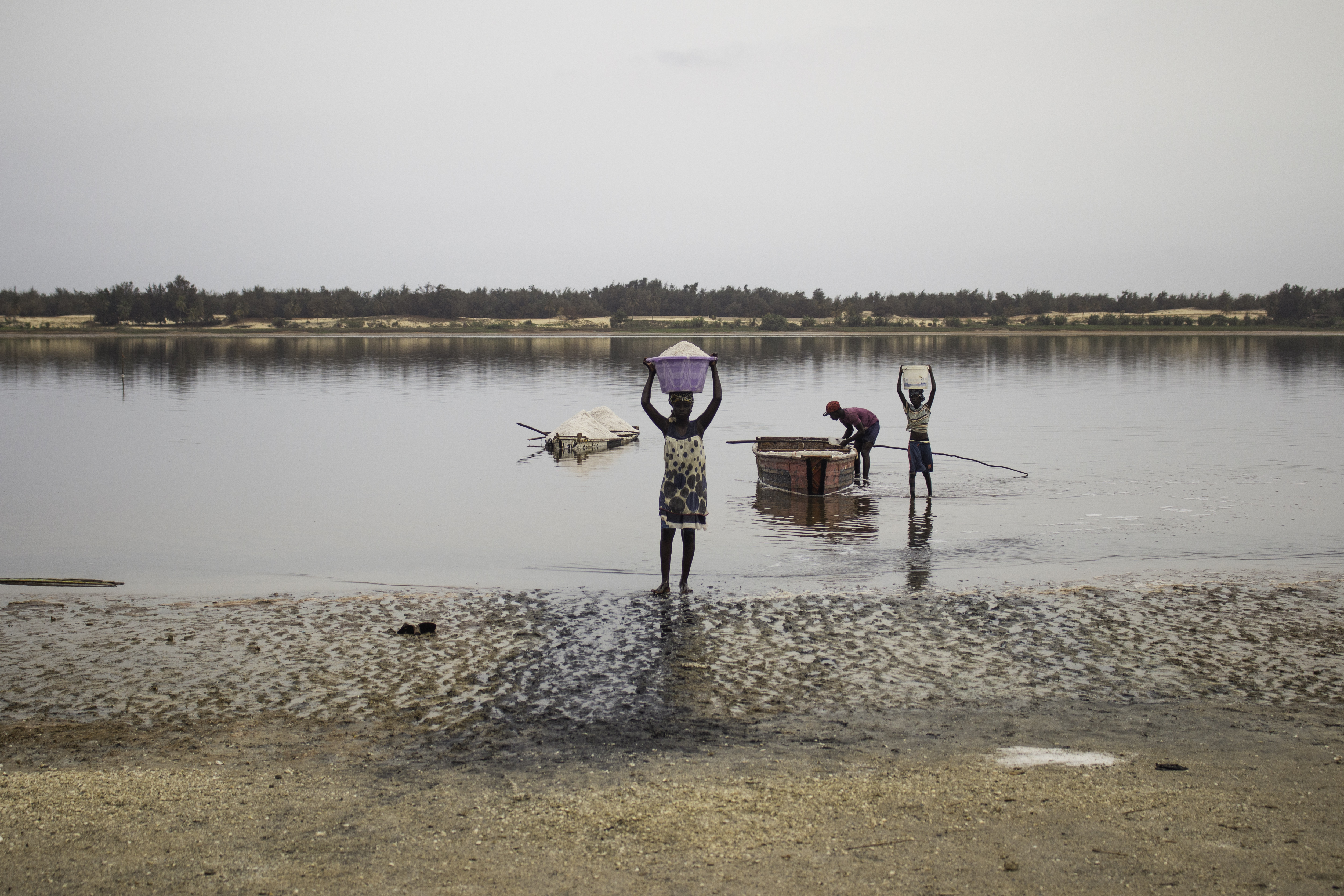 Senegal. El Llac Rosa, un llac que té el mateix volum d’aigua que de sal. Centenars de persones treballen cada dia, sota el sol, en l’explotació de la sal que queda dipositada al fons. Mentre uns l’extreuen de les profunditats i la deixen sobre diferents suports flotants, els altres, la recullen i la traslladen en galledes fins a la vora on s’asseca i es blanqueja per, posteriorment, vendre-la.