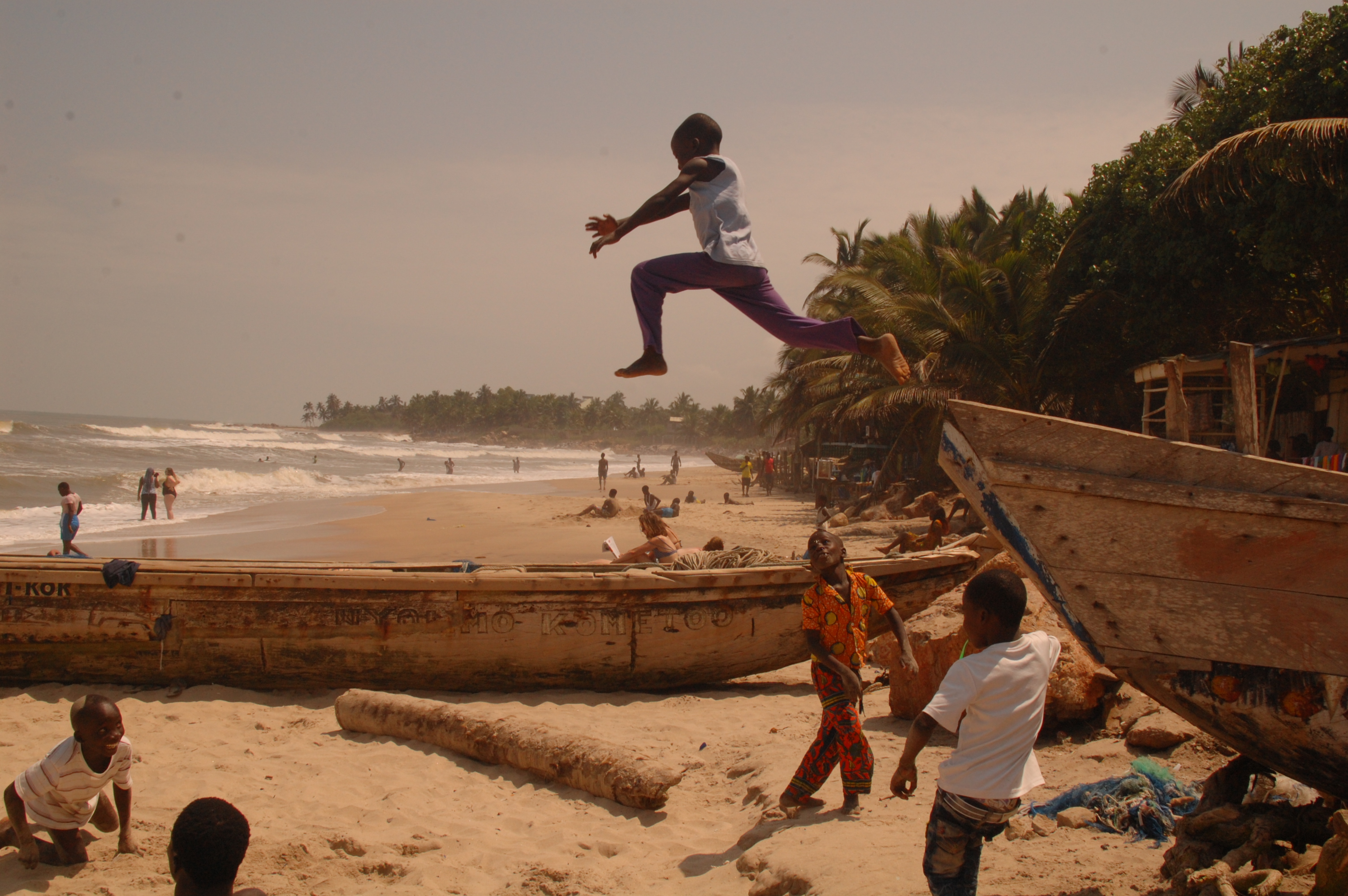 Ghana. En un petit poble coster del sud de Ghana, els petits es diverteixen saltant des de la proa dels vaixells dels pescadors encallats a la sorra, intentant saltar cada cop més alt.