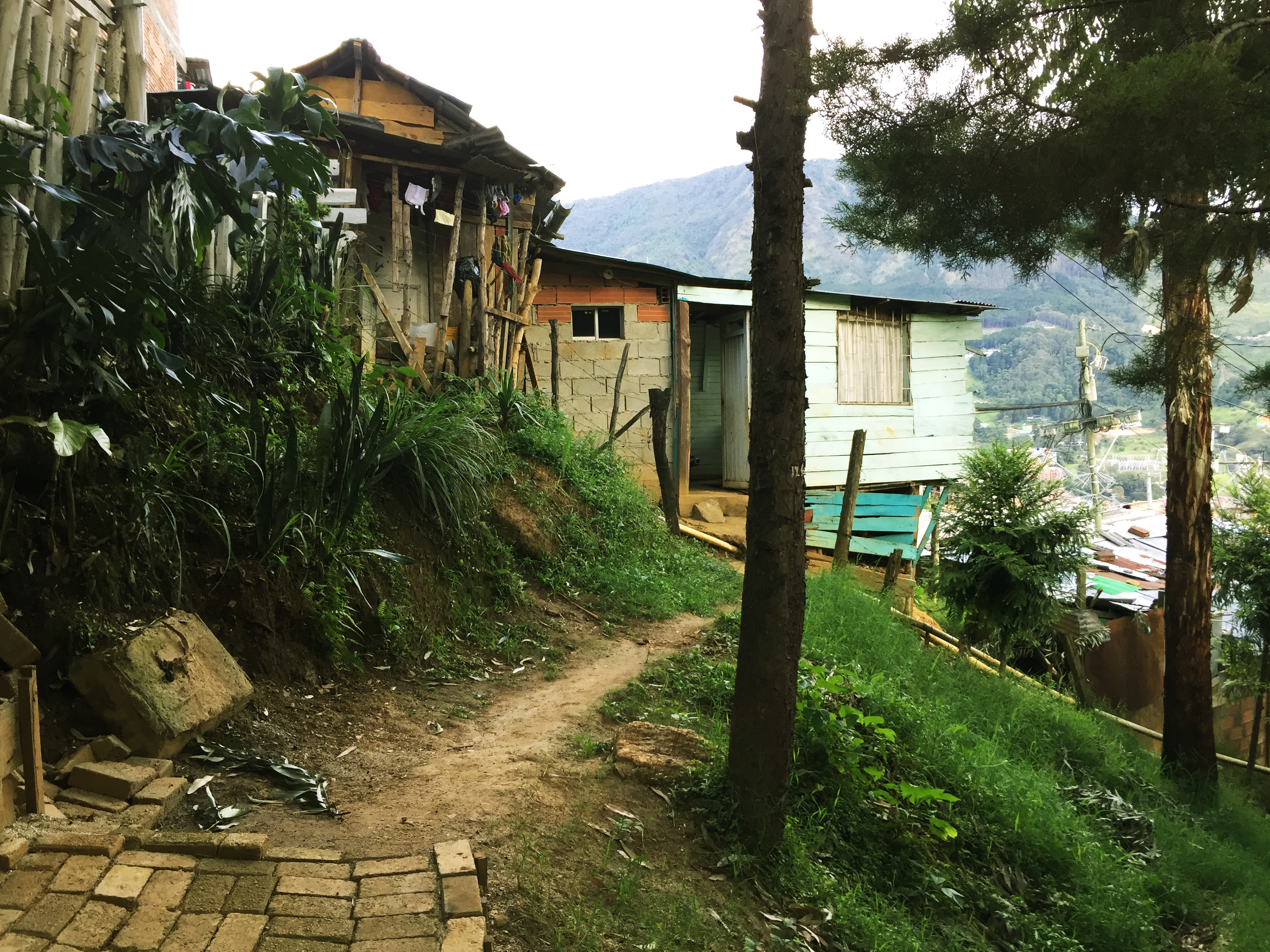 Colòmbia. Observem un fragment del barri format per construccions fetes per persones que van ser expulsades de les seves poblacions rurals per temes sociopolítics i que es van establir en un indret de les muntanyes de Medellín. Són construccions que mostren la inestabilitat que pateixen aquestes persones. Construccions que evidencien la precarietat amb la que viuen. Construccions que es van reinventant i reforçant al veure que no hi ha, de moment, un futur més digne.