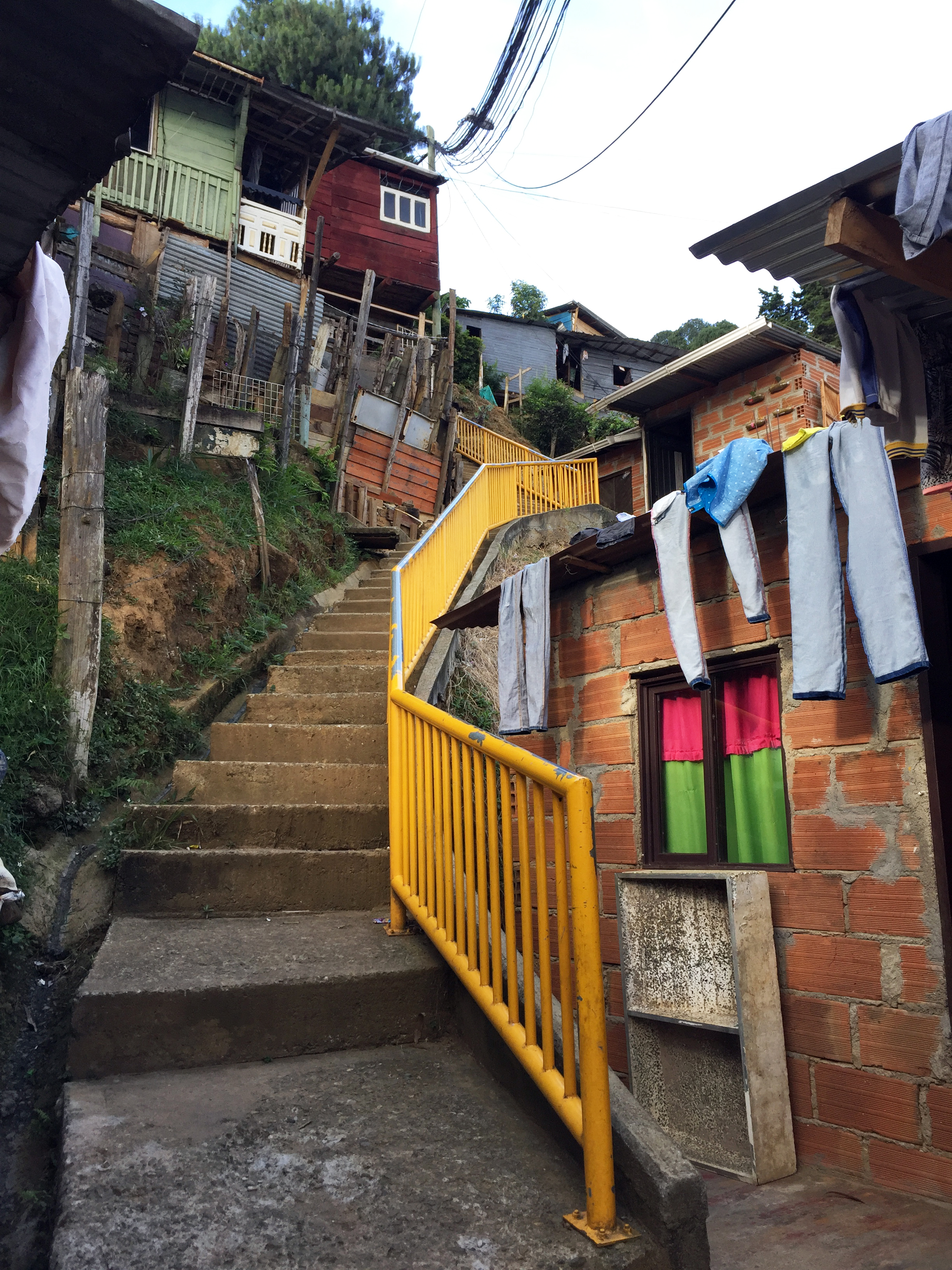 Colòmbia. L'accés principal que tenen els veïns de Pinares d'Oriente per accedir als seus habitatges són les escales, unes escales que tenen un inici i un final, però en cap moment se sap si farà falta ampliar-les a causa de l'augment de l'aparició d'auto-assentaments de tots aquells desplaçats del conflicte que pateix Colòmbia.