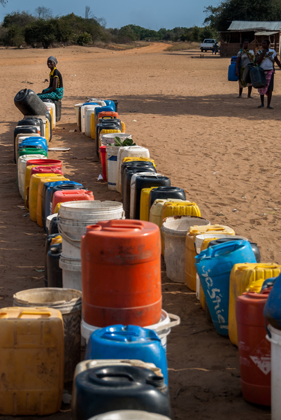 Moçambic. He fet cua moltes vegades per comprar pa o per a pagar al super, però mai per a tenir aigua. Aquestes dones de la comunitat de Tome fan cua per a poder portar aigua a casa seva! En aquest cas havien d’esperar a que hi hagués suficient aigua al dipòsit del minisistema i l’espera es fa més curta si no has de ser físicament a la cua tot i que alguna no es refia i per si de cas espera asseguda sobre la garrafa.